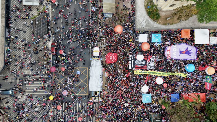 Manifestantes de esquerda se concentram na Praça da República, no centro de São Paulo, com bandeira pela prisão de Bolsonaro.