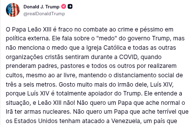 Na noite de ontem (12), Trump publicou uma mensagem nas redes sociais com críticas diretas ao papa, citando falas do pontífice sobre operações militares dos EUA. Leão XIV respondeu afirmando que manterá manifestações contra guerras e não recuará no tema.